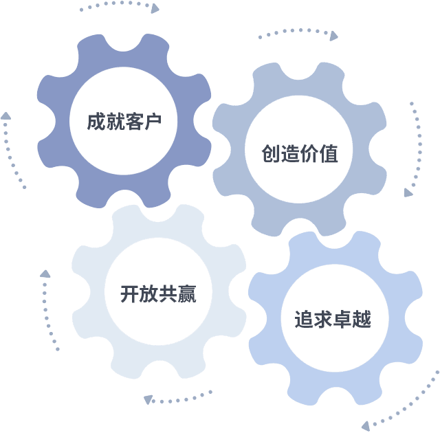 成就客户是一切决策的出发点,,,创造价值是衡量所有工作的标准,,,追求卓越是我们做事做人的态度,,,开放共赢是我们的格局也是最终的结果。。价值观的齿轮环环相扣,,推动着组织里的每个人不断向前。。